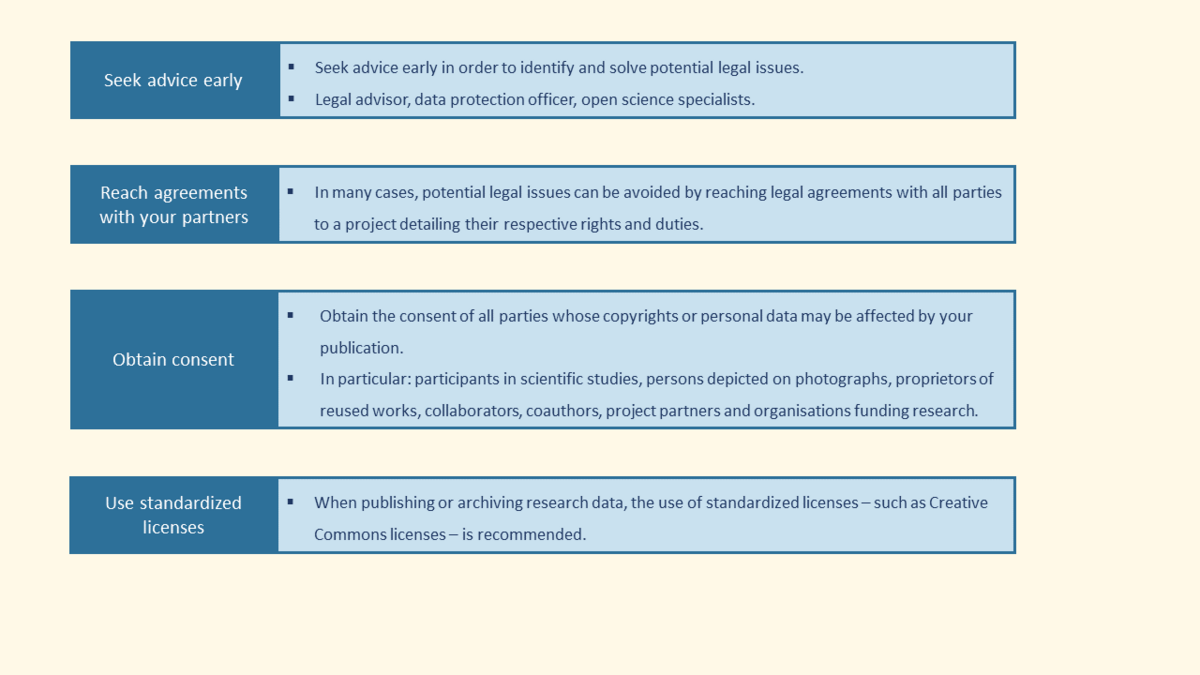 It is therefore advisable to seek legal advice at the beginning of a project. Potential conflicts can be eliminated if contractual arrangements are made at an early stage which bring the diverging interests of all involved parties to a fair balance. In addition, consent required under data protection law should be obtained at the time of data collection. Similarly, the consent required under copyright law for the subsequent use of third-party materials should be obtained before working with them. Last but not least, it is advisable to publish research data under standardized licenses such as Creative Commons licenses, as this reduces legal risks and enhances the visibility of one's own research.