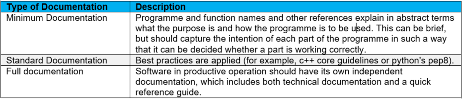 Software must be suitably annotated and, if necessary, documented, even if no publication is planned. Research software must be documented in a way that is comprehensible to the reader. For agile working practice, three levels of comprehensiveness of documentation can be delineated.