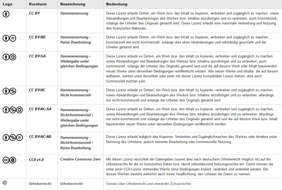 Das disziplinübergreifende Datenarchiv RADAR (Research Data Repository) hat die bestehenden CC-Lizenzen in der untenstehenden Tabelle zusammengestellt: